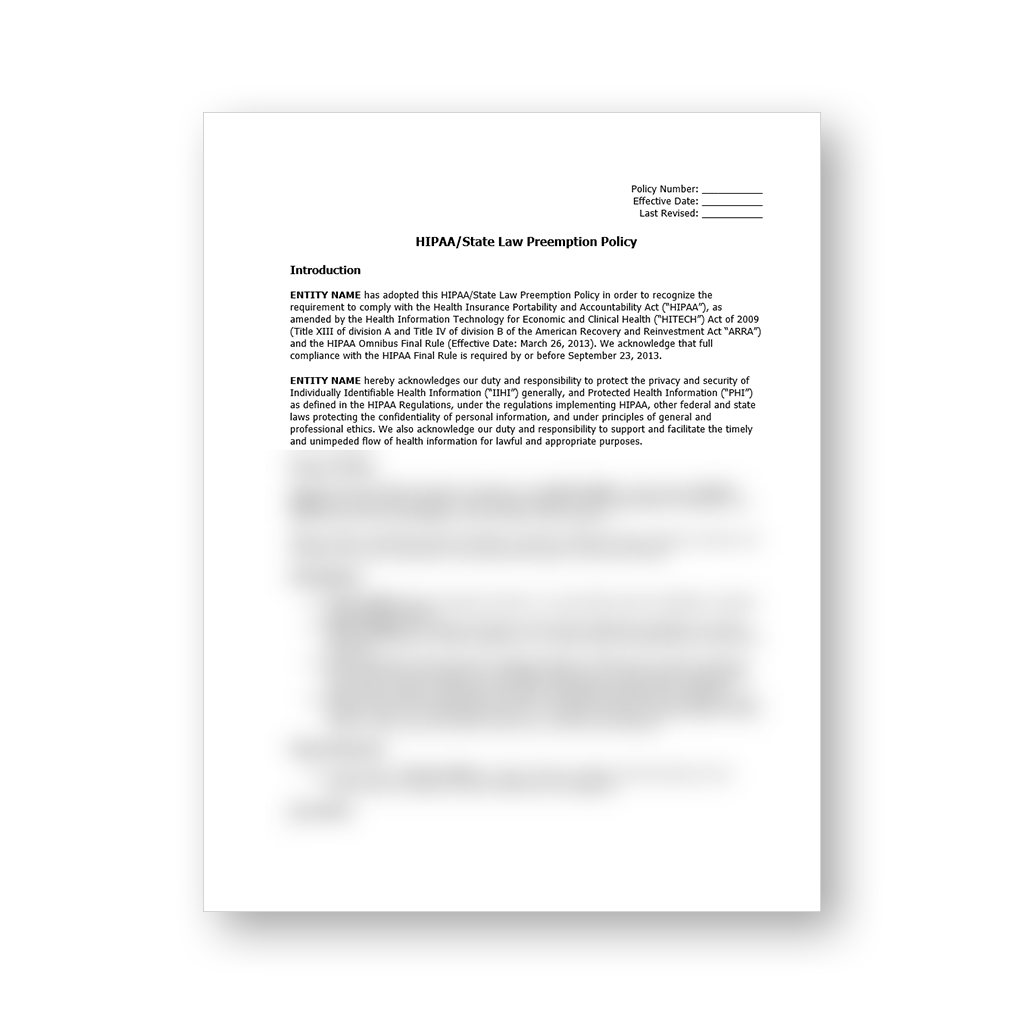 Get compliant with HIPAA and state law quickly, easily, and confidently by utilizing our HIPAA/State Law Preemption Policy Template. Establishing a data privacy and security plan is critical for healthcare organizations to ensure the safety of their customer’s medical information. As part of compliance requirements, entities must analyze and assess state law requirements that could impact HIPAA preemption policies. Now you can minimize the time-consuming task of researching the nuances of state laws with our comprehensive yet easy-to-use product.